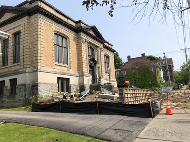 The Carnegie building's historic façade will be restored to visual prominence with the installation of complementary, sustainable, and low-maintenance landscaping. The building stairs will be removed and reconstructed; the pathway stairs and railing will be removed. The hardscaping materials will echo those used during the 1902 construction.